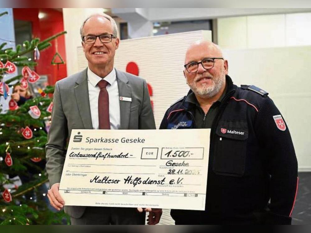 Ein vorweihnachtliches Geschenk in Form eines Schecks über die Summe von 1500 Euro überreichte jetzt das Vorstandsmitglied der Sparkasse Geseke, Bernd Marx (links) an Dieter Ritz vom Geseker Malteser...