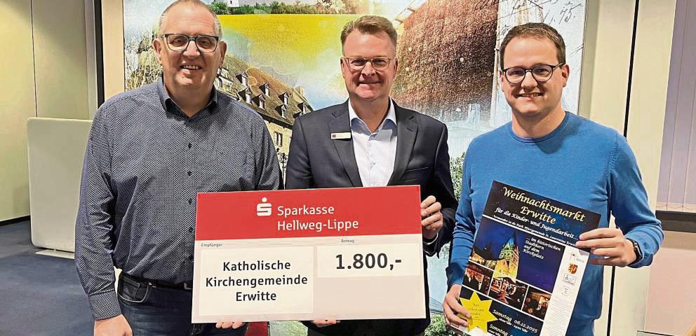 Mit einem Scheck über 1800 Euro unterstützt die Sparkasse Hellweg-Lippe die katholische Kirchengemeinde Erwitte. Die Spende, die Torsten Blöming, Leiter der Filiale in Erwitte, nun an Andreas Jarmatz und Karsten Kremer überreichte, investiert die Gemeinde direkt in die Ausrichtung des Weihnachtsmarktes. „Wir freuen uns, dass uns die Sparkasse auch in diesem Jahr wieder finanziell bei der...
